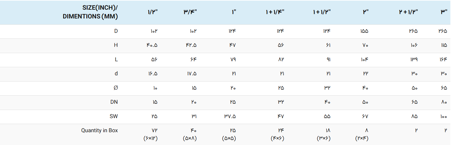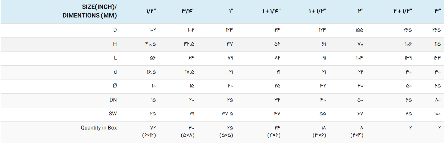 مشخصات اصلیسایز / 1/2 اینچ / 3/4 اینچ / 1 اینچ / 1/4 1 اینچ / 1/2 1 اینچ / 2 اینچ / 1/2 2 اینچ / 3 اینچمشخصات فرعیابعاد1/2 تا 3 اینچفشار کاری استاندارد5 بارجنسبرنج MS 58